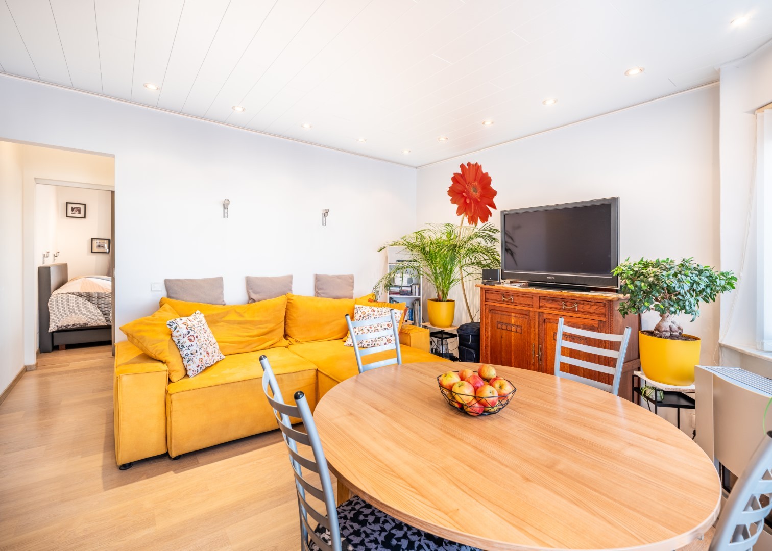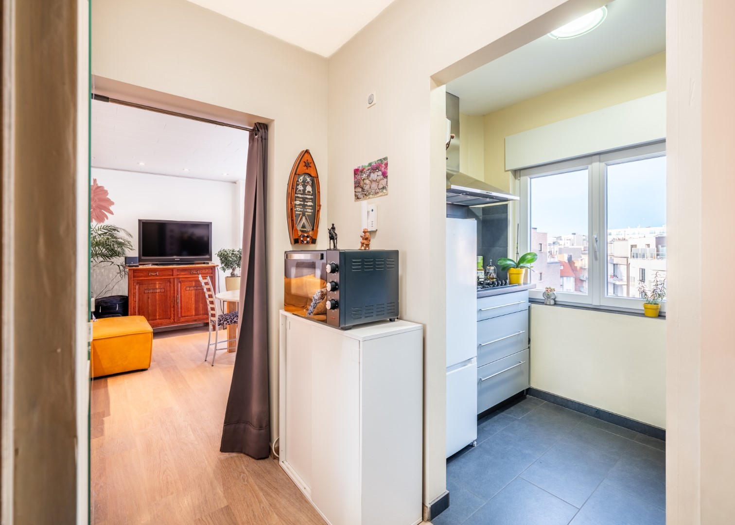 Renovated one-bedroom flat for sale on the fourth floor of the Porto Rico residence. The property enjoys a central yet quiet location in Koksijde. From the living room, you can enjoy an open view and even a glimpse of the sea!