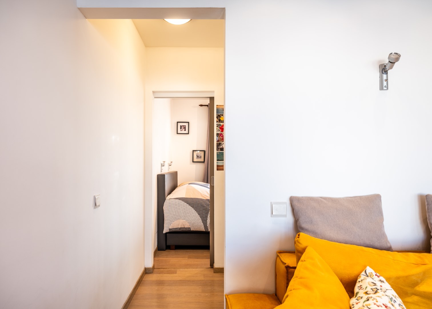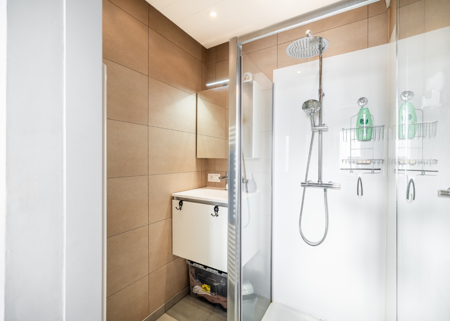 The apartment is laid out as follows: entrance hall | separate, equipped kitchen | cosy living room | night hall | separate toilet | storage cupboard | bedroom with adjoining bathroom with shower and washbasin in cabinet.