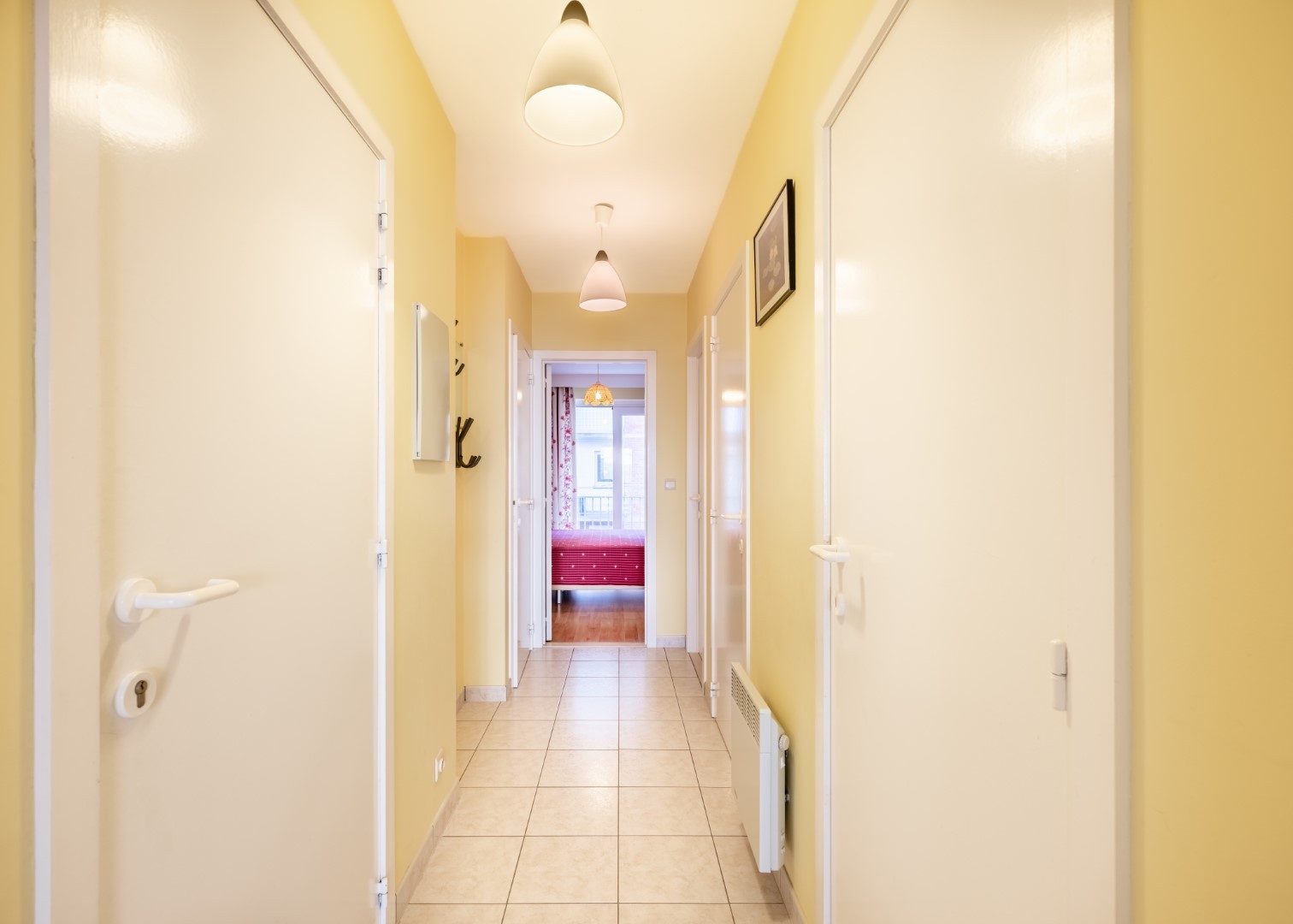 L'appartement est agencé comme suit : hall d'entrée | séjour avec cuisine ouverte équipée donnant sur un balcon avec vue latérale sur la mer | débarras | toilettes séparées | salle de bains avec douche, lavabo dans un meuble et raccordement pour machine à laver | première chambre donnant sur le balcon à l'arrière | deuxième chambre donnant sur le même balcon.