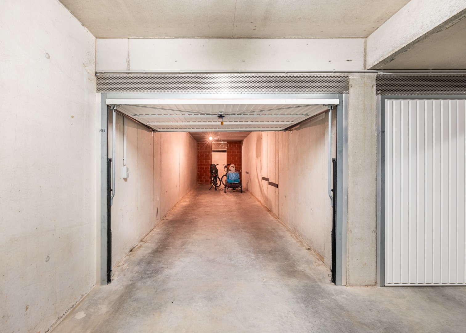 Mogelijkheid tot aankoop van dubbele garagebox (diepte 11m, breedte 2m75) met extra kelderruimte in de residentie.