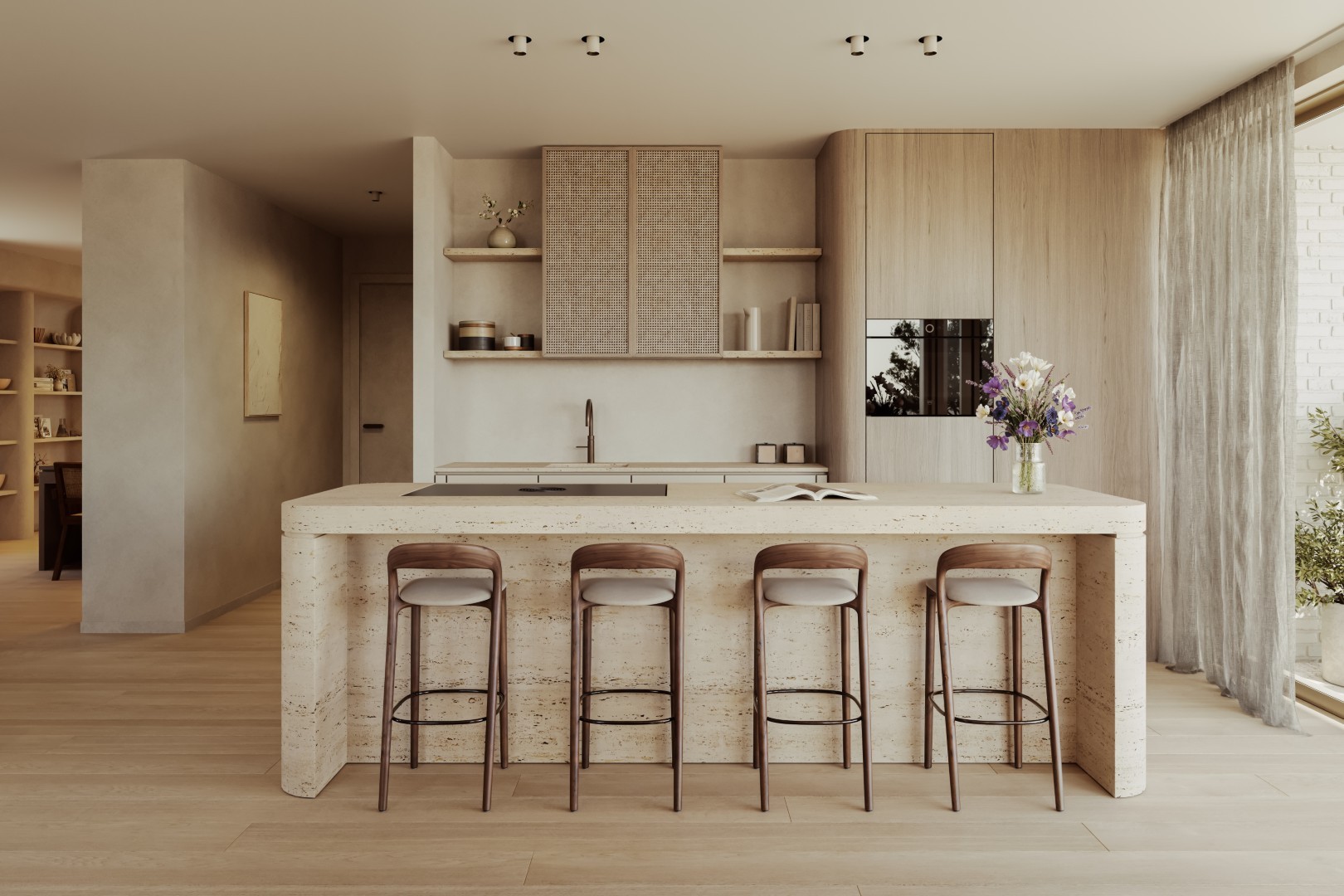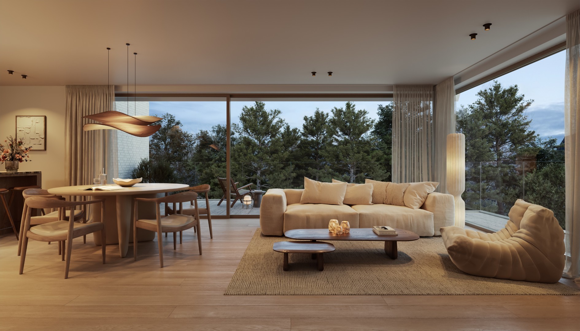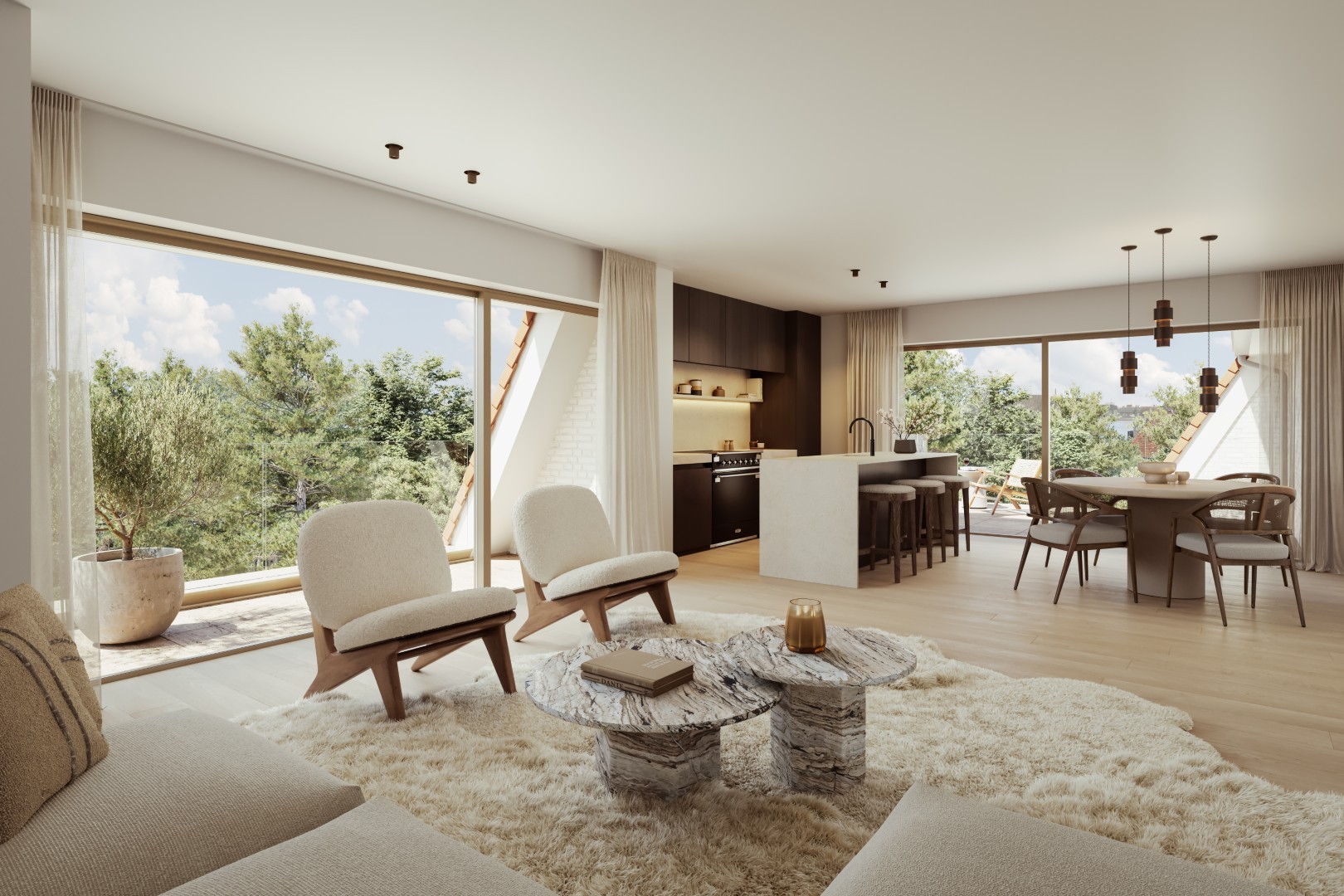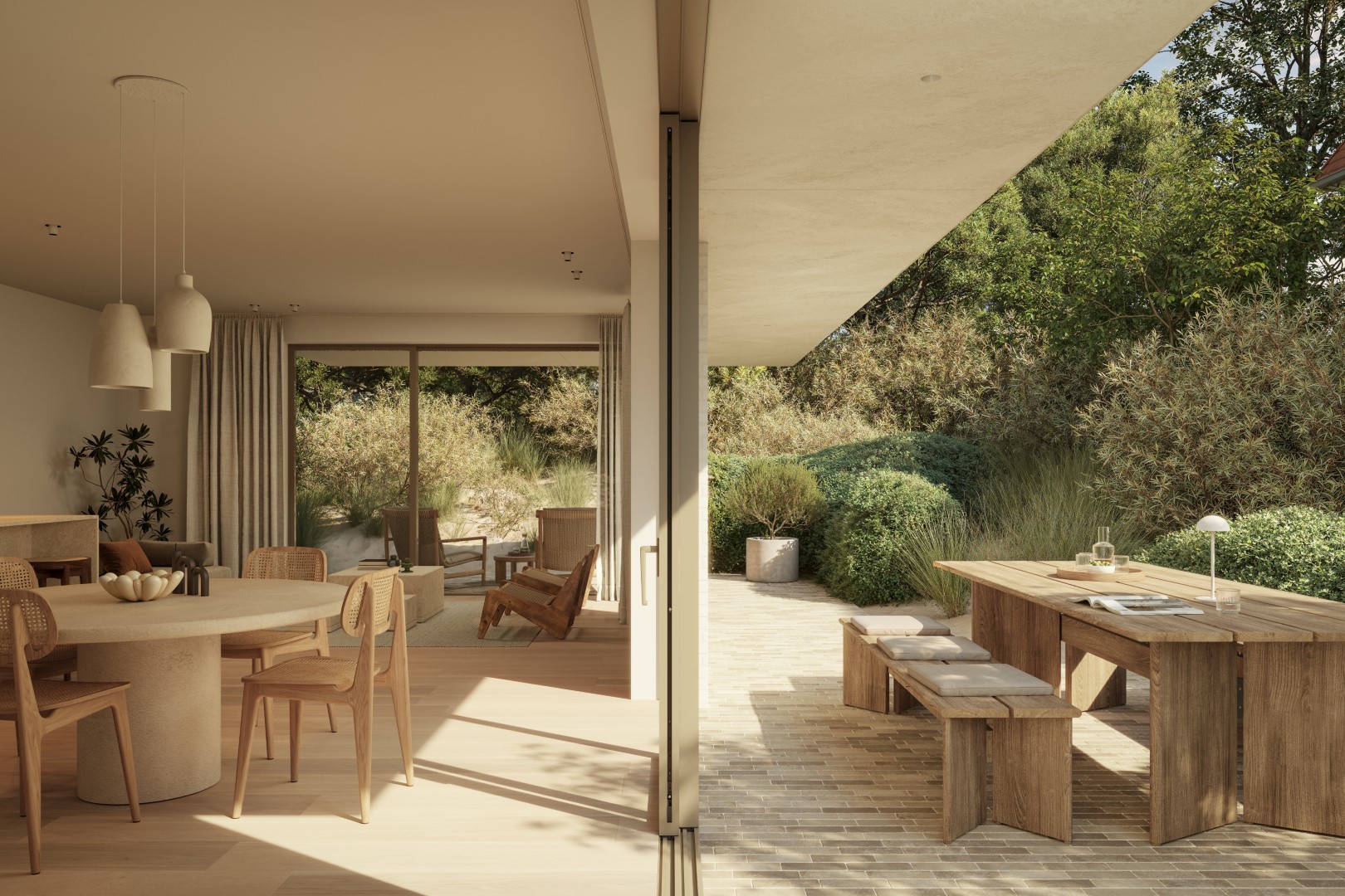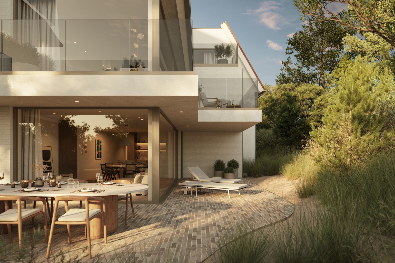 De architectuur is geïnspireerd op de klassieke kustvilla, met een eigentijdse interpretatie die harmonieus aansluit bij de omliggende villawijk. Karaktervolle daklijnen, zorgvuldig geproportioneerde volumes en verfijnde accenten zorgen voor een tijdloos geheel. Grote raampartijen en terrassen versterken het contact met licht en groen en creëren aangename leefruimtes met openheid en rust.